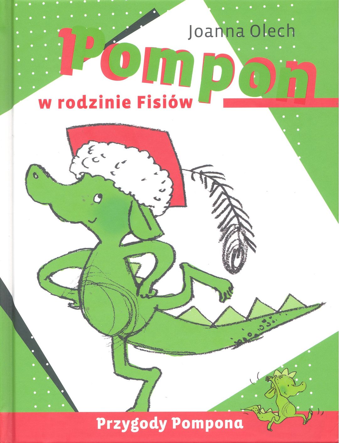 Pompon, czyli właśnie ten smok, pojawił się w rodzinie państwa Fisiów przez odpływ umywalki i już u nich pozostał. Szybko rósł i rozwijał się intelektualnie, by stać się wygadanym, bezczelnym smokiem o bardzo twórczych, czasem niebezpiecznych pomysłach, które wcielał w życie. Miał dwoje oddanych opiekunów - dzieci państwa Fisiów - Malwinę i Gniewosza, którzy pewnego dnia zabrali go nawet na zieloną szkołę. Książka przeznaczona dla dzieci w wieku 6-10 lat, napisana z wielkim poczuciem humoru, jest też zbiorem świetnych obserwacji życia rodzinnego i satyrą na dzisiejszą rzeczywistość. Joanna Olech jest także autorką ilustracji.